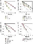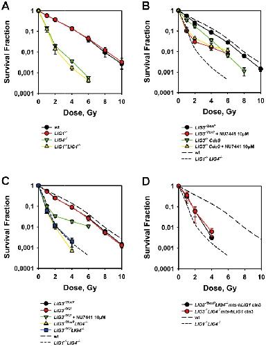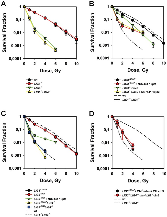 Figure 6. LIG1 and LIG3 contribute to the survival of cells exposed to IR.(A) Cell survival measured by colony formation in wt, LIG1−/−, LIG4−/− and LIG1−/−LIG4−/− cells after exposure to increasing doses of X-rays. Results from three independent experiments with 3 replicates each were used to calculate the indicated means and standard errors. (B) As in A. for LIG3−/2loxP, and LIG3−/−Cdc9 cells after treatment for 1 h before and 4 h after IR with 10 µM NU7441. The dashed lines trace for comparison the results of wt and LIG1−/−LIG4−/− cells. (C) As in B. for LIG3−/2loxP, LIG3−/M2I, LIG3−/2loxPLIG4−/−, and LIG3−/M2ILIG4−/− cells. Results from at least two independent experiments with 3 replicates each were used to calculate the indicated means and standard errors. (D) As in B. for clone 3 of LIG3−/2loxPLIG4−/−mts-hLIG1 and LIG3−/−LIG4−/−mts-hLIG1. Results from at least two independent experiments with 3 replicates each were used to calculate the indicated means and standard errors.