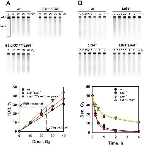 Figure 1. LIG3 processes IR-induced DSBs in LIG1 and LIG4 deficient cells.(A) Representative dose response curves for the induction of DSBs, as measured by PFGE, in cells exposed to increasing doses of X-rays. Images of ethidium bromide stained gels (upper panel) were analyzed to estimate the fraction of DNA released (FDR) from the well into the lane (regions defined as indicated) that is plotted as a function of IR dose for the indicated mutants (lower panel). Results from three independent experiments with 3 samples each were used to calculate the indicated means and standard errors. The dotted lines indicate the approach used to deduce Deq from FDR in DSB repair experiments (see text for details). (B) Repair kinetics of IR-induced DSBs in asynchronous wt, LIG1â/â, LIG4â/â, and LIG1â/âLIG4â/â cells after exposure to 40 Gy X-rays. The upper panel shows typical gels used to calculate the FDR at each repair time point, which was subsequently converted to Deq with the help of dose response curves such as those shown in A but generated with the same cell population used in the repair experiment (see text for details). Results of three determinations from at least two independent experiments were used to calculate the indicated means and standard errors (lower panel).