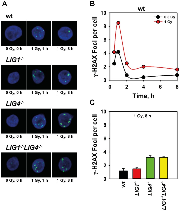 Figure 2. LIG3 supports processing of DSBs also after low doses of radiation.(A) Representative images of γ-H2AX foci formation in wt, LIG1â/â, LIG4â/â and LIG1â/âLIG4â/â DT40 cells after exposure to 1 Gy X-rays at the indicated times after IR. (B) Representative kinetics of γ-H2A.X foci formation and decay of wt DT40 cells as measured by immunostaining after exposure to 0.5 and 1 Gy X-rays. The results shown represent the analysis of 4000 nuclei in one representative experiment. (C) γ-H2A.X foci scored in wt, LIG1â/â, LIG4â/â and LIG1â/âLIG4â/â cells 8 h after exposure to 1 Gy X-rays. Foci measured in non-irradiated cells have been subtracted. Results of two independent experiments, in which 8000 nuclei were scored, were used to calculate the indicated means and standard errors.