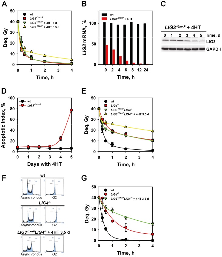 Figure 3. Conditional knockout of LIG3 reveals the function of LIG1 in the processing of IR-induced DSBs.(A) Kinetics of DSB processing in the indicated mutants after treatment with 4HT for the indicated periods of time. Other details are as in Fig. 1B. Results from three independent experiments with 3 samples each were used to calculate the indicated means and standard errors. (B) LIG3 mRNA levels measured by real-time PCR in wt and LIG3−/2loxP cells after different incubation times with 4HT. The mRNA level measured in wt cells was set to 100%. (C) Western blot analysis of LIG3 protein in LIG3−/2loxP cells after treatment with 4HT for the indicated periods of time. A mouse monoclonal antibody against human LIG3 (clone 1F3) that recognizes the chicken LIG3 was used. GAPDH is a loading control. (D) Apoptotic index measured by microscopically scoring nuclear fragmentation and pycnosis in wt and LIG3−/2loxP cells at various times after treatment with 4HT. Results from two independent experiments in each of which 1000 cells were scored were used to calculate the indicated means and standard errors. (E) As in A for the indicated mutants. (F) Representative cell-cycle distribution histograms obtained by flow cytometry in wt, LIG4−/− and LIG3−/2loxPLIG4−/− cells treated with 4HT for 3.5 days before and after enrichment by centrifugal elutriation in G2 phase of the cell cycle. (G) Kinetics of DSB processing in cells enriched by centrifugal elutriation in the G2 phase of the cell cycle as shown in F.