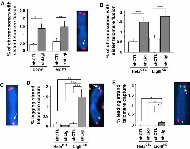 DNA ligase I (LigI) plays a central role in the joining of strand interruptions during replication and repair. In our current study, we provide evidence that DNA ligase III (LigIII) and XRCC1, which form a complex that functions in single-strand break repair, are required for the proliferation of mammalian LigI-depleted cells. We show from our data that in cells with either dysfunctional LigI activity or depleted of this enzyme, both LigIII and XRCC1 are retained on the chromatin and accumulate at replication foci. We also demonstrate that the LigI and LigIII proteins cooperate to inhibit sister chromatid exchanges but that only LigI prevents telomere sister fusions. Taken together, these results suggest that in cells with dysfunctional LigI, LigIII contributes to the ligation of replication intermediates but not to the prevention of telomeric instability.