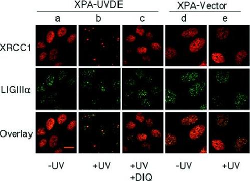 Figure 1. Accumulation of XRCC1 and LIGIIIα at SSBs after local UV-irradiation in XPA-UVDE cells. Co-localization of XRCC1 with LIGIIIα was identified by double immunolabeling. Two minutes after local UV-irradiation (20 J/m2) cells were fixed with paraformaldehyde and co-stained with anti-XRCC1 antibody (red, upper row) and anti-LIGIIIα antibody (green, middle row); the column c is for XPA-UVDE cells treated with DIQ, an inhibitor of PARP, before UV-irradiation. Co-localization of XRCC1 with LIGIIIα appears yellow in overlay (bottom row).