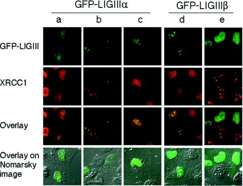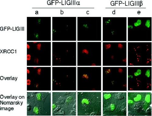 Figure 2. In situ visualization of GFP-DNA LIGIIIα, GFP-DNA LIGIIIβ and XRCC1 before and after local UV-irradiation. GFP–DNA Ligase IIIα (GFP-LIGIIIα) and GFP–DNA Ligase IIIβ (GFP-LIGIIIβ) were transiently expressed in XPA-UVDE cells before UV-irradiation (20 J/m2). The fluorescence images of the cells stained with anti-XRCC1 (red, second upper row) and the images of GFP (green, uppermost row) are shown. Co-localization appears yellow (third row). GFP-tagged proteins were visualized 2 min after local UV-irradiation (20 J/m2). Column c is for DIQ treated cells. The fluorescent images of GFP were superimposed onto the Nomarsky images in the bottom row.