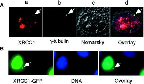Figure 3. XRCC1 in centrosomes of HeLa cells during interphase. (A) Fluorescent micrographs of HeLa cells in interphase obtained by double immunolabeling for γ-tubulin and XRCC1. Cells were fixed with methanol:acetone and co-stained with anti-XRCC1 antibody (a), and anti-γ-tubulin antibody (b). XRCC1 and γ-tubulin appear red and green, respectively. The corresponding Nomarsky image is shown in (c). Co-localization of both XRCC1 and γ-tubulin appears yellow in overlay (d). (B) Fluorescent micrographs of HeLa cells in interphase expressing XRCC1-GFP. The cells were fixed with paraformaldehyde. DNA was stained with TOPRO-3 (middle panel) and superimposed onto the fluorescent image in the uppermost panel. Arrows indicate the position of centrosomes.