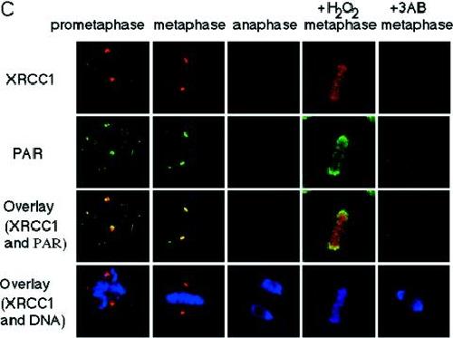Figure 4. Co-localization of XRCC1 in the centrosomes of HeLa cells from different mitotic phases. (A) Double immunolabeling for XRCC1 and γ-tubulin. The cells were fixed with methanol:acetone and stained with anti-XRCC1 (red) and anti-γ-tubulin (green) antibodies. Co-localization of the proteins appears yellow in the third row after overlay. DNA was stained with TOPRO-3 and superimposed onto the fluorescent images of the uppermost row (the bottom row). (B) Double immunolabeling for LIGIIIα and XRCC1. The cells were fixed with paraformaldehyde and stained with anti-XRCC1 (red) and anti-LIGIIIα (green) anti-bodies. Co-localization of the proteins appears yellow. (C) Double immunolabeling for PAR and XRCC1. The cells were fixed with methanol:acetone, and co-stained with anti-XRCC1 (red) and anti-PAR (green) antibodies. Panels in the first, the second and the third column are for untreated cells in prometapahase, metapahase and anaphase, respectively. Co-localization of the proteins appears yellow. DNA was stained with TOPRO-3 and superimposed onto the fluorescent images of the uppermost row (the bottom row).