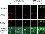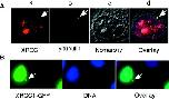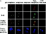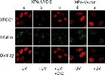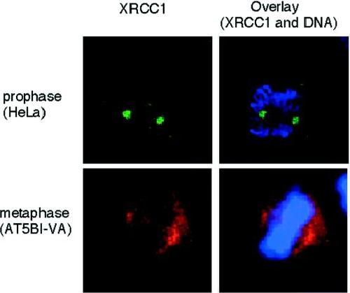Figure 5. Distribution of XRCC1 in human cell lines. The upper left panel: fluorescent micrograph of HeLa cell in prophase by immunolabeling for XRCC1. The cells were fixed with paraformaldehyde, and stained with anti-XRCC1 monoclonal antibody. The lower left panel: fluorescent micrograph of AT5BI-VA cell in metaphase by immunolabeling for XRCC1. The cells were fixed with methanol:acetone, and stained with anti-XRCC1 antibody. The DNA was stained with TOPRO-3 and the corresponding images were superimposed onto the fluorescent images in the left columns and shown in the right columns.