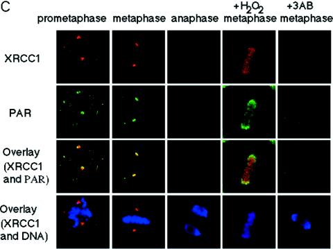 DNA single-strand breaks (SSBs) are the most frequent lesions caused by oxidative DNA damage. They disrupt DNA replication, give rise to double-strand breaks and lead to cell death and genomic instability. It has been shown that the XRCC1 protein plays a key role in SSBs repair. We have recently shown in living human cells that XRCC1 accumulates at SSBs in a fully poly(ADP-ribose) (PAR) synthesis-dependent manner and that the accumulation of XRCC1 at SSBs is essential for further repair processes. Here, we show that XRCC1 and its partner protein, DNA ligase IIIalpha, localize at the centrosomes and their vicinity in metaphase cells and disappear during anaphase. Although the function of these proteins in centrosomes during metaphase is unknown, this centrosomal localization is PAR-dependent, because neither of the proteins is observed in the centrosomes in the presence of PAR polymerase inhibitors. On treatment of metaphase cells with H2O2, XRCC1 and DNA ligase IIIalpha translocate immediately from the centrosomes to mitotic chromosomes. These results show for the first time that the repair of SSBs is present in the early mitotic chromosomes and that there is a dynamic response of XRCC1 and DNA ligase IIIalpha to SSBs, in which these proteins are recruited from the centrosomes, where metaphase-dependent activation of PAR polymerase occurs, to mitotic chromosomes, by SSBs-dependent activation of PAR polymerase.