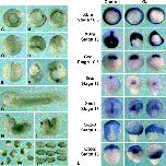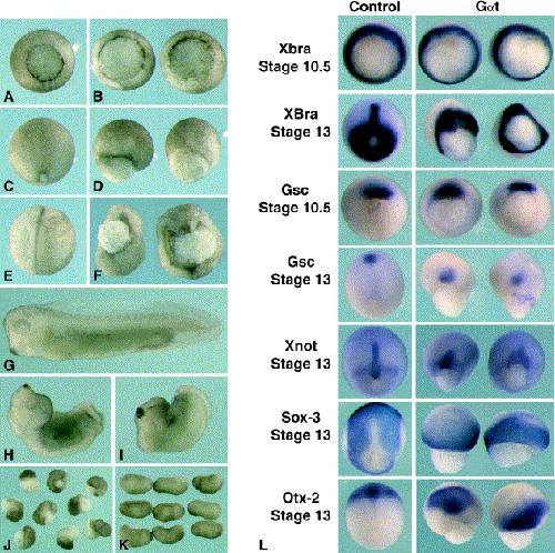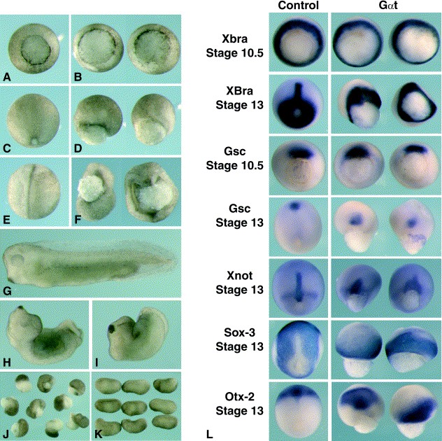Fig. 8. Dorsal expressions of Gαt inhibits gastrulation movements. Messenger RNA encoding Gαt was injected dorsally as described in Fig. 6. Embryos were cultured and scored for anomalies of external morphology. Representative examples are shown at early (A, B), late gastrula stage (C, D), neurula stage (E, F), and tailbud stage (GâI). (A, C, E, G) Sibling controls. (B, D, F, H, I) Gαt-injected embryos. Blastopore closure is strongly affected as a result of Gαt expression. Even when blastopore closure completes, dorsal axis elongation is clearly inhibited (H, I). (J, K) Gαt phenotype specifically results from the inhibition of Gβγ signaling. Blastopore closure and dorsal axis elongation blocked by Gαt expression (J) are restored by coexpression of Gβ1 and Gγ2 (K). (L) Dorsal expression of Gαt does not affect mesodermal or neural patterning. Embryos were fixed at early (st. 10.5) and late gastrula stage (st.13), and were processed for in situ hybridization analysis of mesodermal (Xbra, gsc, Xnot, Otx-2) and neural (Sox-3, Otx-2) marker genes expression. All markers analyzed can be detected in Gαt-injected embryos, showing that Gαt directly interferes with morphogenetic movements, and not with tissue specification. Xnot expression at st. 13 reveals that notochord is present dorsally. However, notochord elongation has been dramatically inhibited, indicating that convergent extension is strongly affected. At st.13, Otx-2 and gsc transcripts are also clearly detected in mesendoderm but at a location which suggests that mesendoderm has failed to undergo normal involution.