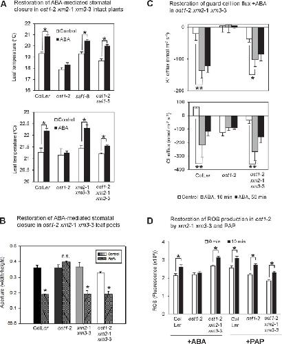 Figure 4. Restoration of ABA-responsive stomatal closure, guard cell ion fluxes and ROS production in ost1-2 xrn2-1 xrn3-3.(A) Leaf temperature, a proxy of stomatal closure, in leaves of intact plants of wild type, ost1-2, sal1-8, ost1-2 sal1-8, xrn2-1 xrn3-3 and ost1-2 xrn2-1 xrn3-3 after treatment with 20 µM ABA for 2 hr. Significant differences relative to control are indicated by asterisk (*p<0.05). Values shown are means ± SEM of 3–9 biological replicates per treatment. The ABA responses of ost1-2 sal1-8 and associated controls were performed in an earlier, independent experiment compared to ost1-2 xrn2-1 xrn3-3. (B) Stomatal aperture in leaf peels of wild type, ost1-2, xrn2-1 xrn3-3 and ost1-2 xrn2-1 xrn3-3 after treatment with 50 µM ABA for 2 hr (40–60 stomata per genotype ± SD). Significant difference (*) at p<0.05 is shown for +ABA. The same trend was observed in two independent experiments. (C) Effects of 500 µM ABA on combined net flux of each of the ion transporters for K+ and Cl− from guard cells in leaf epidermal peels of four-week old Arabidopsis plants. Average net ion fluxes ± SEM (n = 4–12 plants) are shown for control, 10 min and 50 min after ABA treatment. Significant differences are indicated by asterisks (*p<0.05, **p<0.01; ANOVA) (D) Mean corrected total cell fluorescence of ROS in the presence of 2’,7’-dichlorodihydrofluorescein diacetate (H2DCFDA), a ROS probe that detects primarily H2O2 and to a lesser extent hydroxyl radicals (Wojtala et al., 2014), in guard cells before and after 10 min of 100 µM ABA or 100 µM PAP. Means ± SEM of 110–190 (+ABA) or 130–200 (+PAP) stomata from four biological replicates per genotype are shown with significant differences denoted (t-test, p<0.05).DOI: http://dx.doi.org/10.7554/eLife.23361.011 |