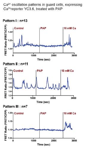 Figure 6. Exogenous PAP does not stimulate cytosolic Ca2+ transients in guard cells.Three representative Ca2+ oscillation patterns obtained from time-resolved Ca2+ imaging experiments with PAP treatment. Numbers of observed cells in each group are labeled above each graph (measurements were obtained from 10 different plants). Guard cells of YC3.6 plants were monitored for their FRET emission at 535 nm and 480 nm. FRET ratio increases after the addition of 10 mM Ca2+ suggesting the cells are capable of sensing intracellular Ca2+ level changes.DOI: http://dx.doi.org/10.7554/eLife.23361.014 |