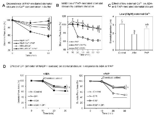 Figure 7. Interaction between PAP-mediated signaling with Ca2+.(A) Wild type stomatal aperture with or without PAP in the presence of low (50 µM) Ca2+ or high (1 mM) Ca2+ in the measuring buffer. Means ± SEM for 9â10 stomata per treatment are shown. Significant differences between treatments at t = 60 min (ANOVA, p<0.05) are indicated by a, b. (B) Stomatal aperture in leaf peels treated with PAP and an intracellular calcium chelator (BAPTA-AM) or an extracellular calcium chelator (EGTA).Values are relative to control (measuring buffer). Means ± SEM for 18 stomata from four plants per treatment are shown. Significant differences between treatments at t = 60 min (ANOVA, p<0.05) are indicated by a, b. (C) Stomatal aperture in leaf peels treated with control (ethanol), 100 µM PAP or 10 µM ABA in the presence of low Ca2+ (50 µM). Means and SEM for four plants with >28 stomata per plant are shown. Significant differences between treatments (ANOVA, p<0.05) are indicated by a, b. (D) Stomatal aperture in leaf peels that were pretreated with 20 µM diphenyleneiodonium (DPI) prior to treatment with either 100 µM PAP or 100 µM ABA, in measuring buffer. The control treatment was leaf peels which were not pretreated with DPI and were treated with measuring buffer. Values are means ± SEM for 41â51 stomata per treatment. Final level of closure was considered by ANOVA after treatment; significant difference (p<0.05) denoted a, b.DOI: http://dx.doi.org/10.7554/eLife.23361.015 |