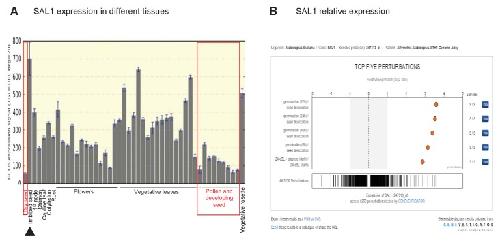 Figure 8—figure supplement 1. Role of SAL1 and PAP in regulating seed germination.Wild type seed differentially regulates SAL1 transcript and protein abundance to accumulate more PAP than leaves. (A) SAL1 expression is the lowest during seed development and in dry seed (red boxes), and highest when the seed is imbibed (black arrow). Data visualized from publically-deposited microarray data using eFP Browser. (B) Analysis of publically-deposited microarray data in Genevestigator using the Genevisible tool reveals that the top four environmental changes that exert the highest degree of change in SAL1 transcript abundance, out of >3000 perturbations, are the transition from dry seed to germinating seed. This suggests that the transcriptional repression of SAL1 and the associated PAP accumulation in seed are key aspects of seed development and dormancy.DOI: http://dx.doi.org/10.7554/eLife.23361.017 |