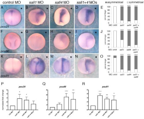 pou5f3 family gene expression is derepressed in sall morphants. Splice-blocking sall1 and sall4 morpholinos cause an increase in pou5f3 family gene expression, as assayed by whole-mount RNA in situ hybridization at stages 16 for pou25 (A-E), pou60 (F-J), and pou91 (K-O); dorsal view, anterior up. Asterisks in images indicate injected side. Quantification (E, J, and O) shows the percentage of embryos with symmetrical (white bars) or asymmetrical (grey bars) pou5f3 expression; n >16 embryos per condition, *** p<0.001 by pairwise chi-squared test. Quantitative RT-PCR data for bilaterally-injected sall morphants is shown in P-R; * p<0.05, ** p<0.01, *** p<0.001 by Tukey's Honestly Significantly Different test on data from 4 biological replicates.