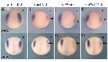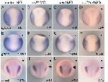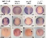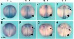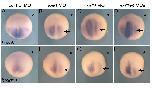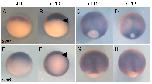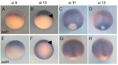Whole-mount RNA in situ hybridization for sall1 (A-D) and sall4 (E-H) transcripts just before and during gastrulation, stages 19 (A, E), 10 (B, F), 11 (C, G) and 12 (D, H); vegetal view, dorsal up (A-B, E-F) or dorsal view, anterior up (C-D, G-H). Arrowheads indicate the dorsal blastopore lip. Expression of sall1 and sall4 at later stages is shown in Figure 1.