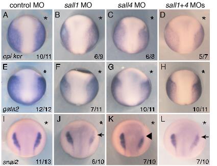 sall1 and sall4 morpholinos do not affect epidermal markers (A-H) but do induce changes in neural crest marker gene expression (I-L), as assayed by whole-mount RNA in situ hybridization at stage 16; dorsal view, anterior up. Splice-blocking sall1 and sall4 morpholinos were injected unilaterally into the embryos shown here. Representative images are shown for epidermal keratin (epi ker, A-D), gata2 (E-H), and snai2 (I-L). Asterisks in images indicate injected side; arrows indicate partial loss of expression; arrowheads indicate posterior shifts in expression. Values in the lower right of each panel indicate the number of embryos with the depicted expression pattern. Expression of snai2 in sall morphants at earlier stages is shown in Supplementary Figure 5.