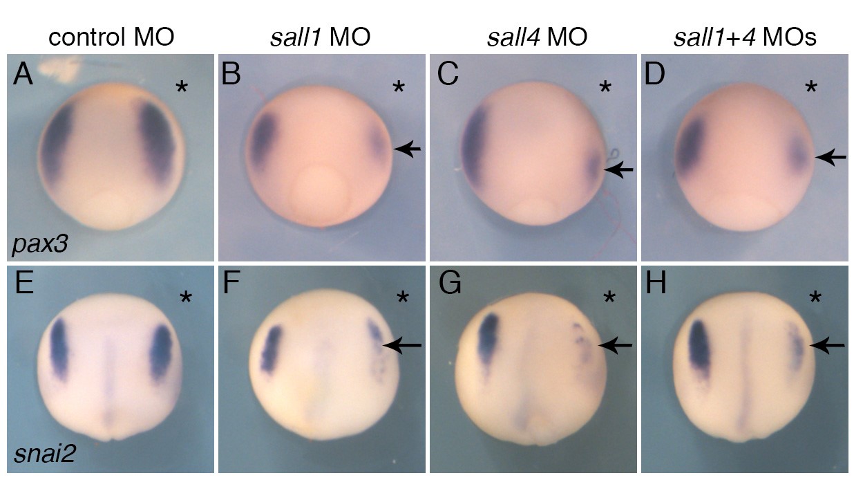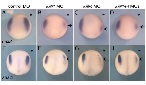 Splice-blocking sall1 and sall4 morpholinos induce partial loss of neural crest marker gene expression, as assayed by whole-mount RNA in situ hybridization at stage 13 using markers pax3 (A-D) and snai2 (E-H); dorsal view, anterior up. Splice-blocking sall1 and sall4 morpholinos were injected unilaterally into the embryos shown here. Representative images are shown. Asterisks in images indicate injected side; arrows indicate partial loss of expression. Expression of snai2 in sall morphants at later stages is shown in Supplementary Figure 4.