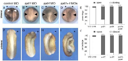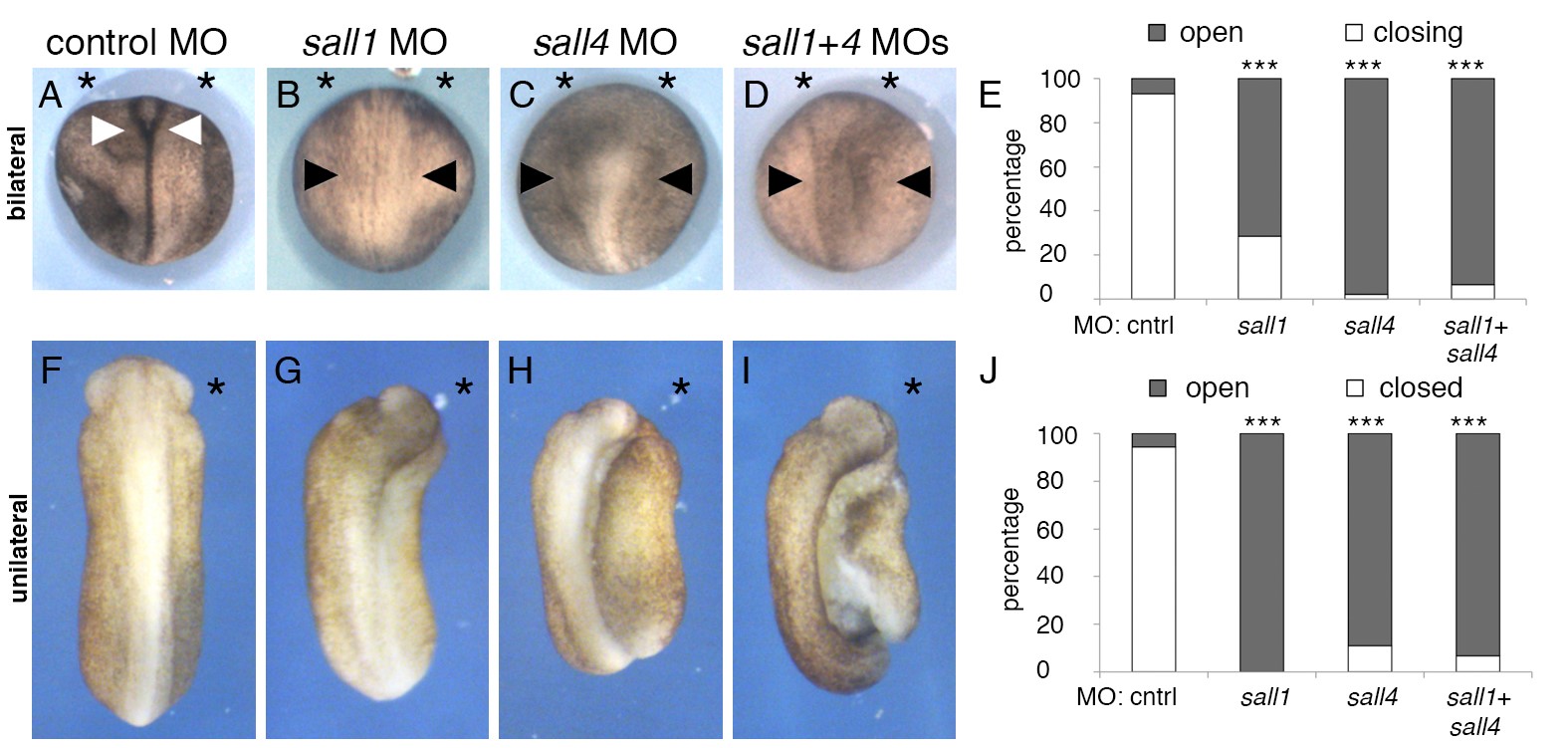 (F-I) Stage 23 embryos after unilateral injection of morpholino(s); dorsal view, anterior up. Asterisks in images indicate injected side. Quantification (J) shows the percentage of embryos with closing (white bars) or open (grey bars) neural tubes. This represents total combined data including splice-blocking and translation-blocking morpholino experiments. n > 15 embryos per experimental condition; *** p < 0.001 by pairwise chi-squared test.