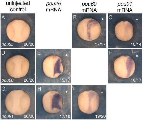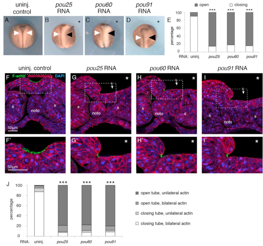 (F-Iâ²) Confocal microscopy after transverse sectioning and staining of pou5f3-overexpressing embryos; dorsal is up. Sections were taken from the anterior third of embryos, where primary neurulation is most easily observed. F-actin (phalloidin, green), microtubules (anti-DM1α antibody, red), nuclei (DAPI, blue). Asterisks in images indicate injected side; white arrows indicate loss of actin accumulation. Fâ²-Iâ² show higher magnification views of F-I. Scale bars =50 µm. s= somite, noto = notochord. Quantification (J) shows the percentage of embryos with closing (lighter bars) or open (darker bars) neural tubes, further classified by actin laterality (see key). n >55 embryos per experimental condition; *** p<0.001 by pairwise chi-squared test.
