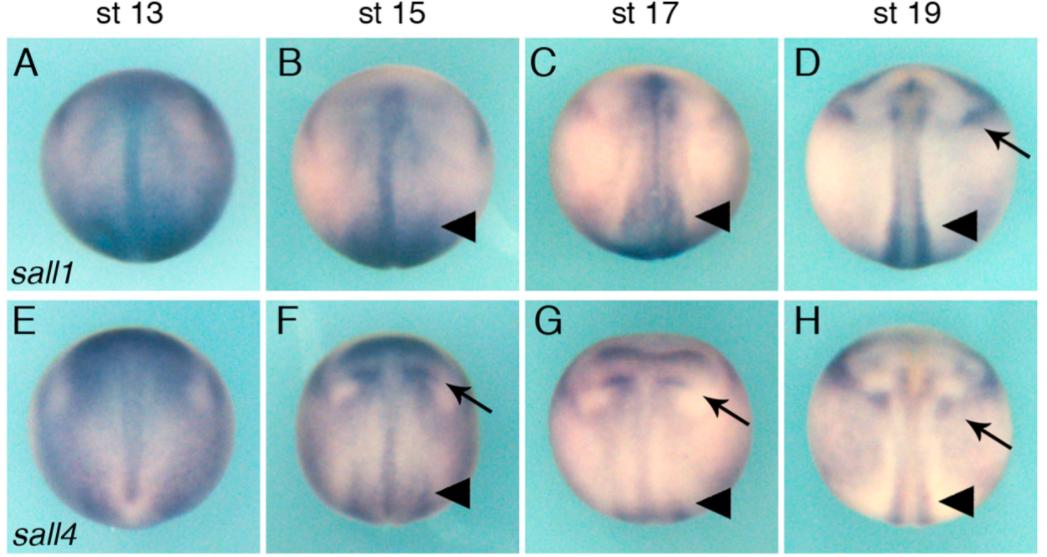 sall1 and sall4 are expressed throughout early neural development. Whole-mount RNA in situ hybridization for sall1 (A-D) and sall4 (E-H) transcripts during neurulation, stages 13 (A, E), 15 (B, F), 17 (C, G) and 19 (D, H); dorsal view, anterior up. Arrows and arrowheads indicate domains referenced in the text. Expression of sall1 and sall4 at earlier stages is shown in Supplementary Fig. 1.