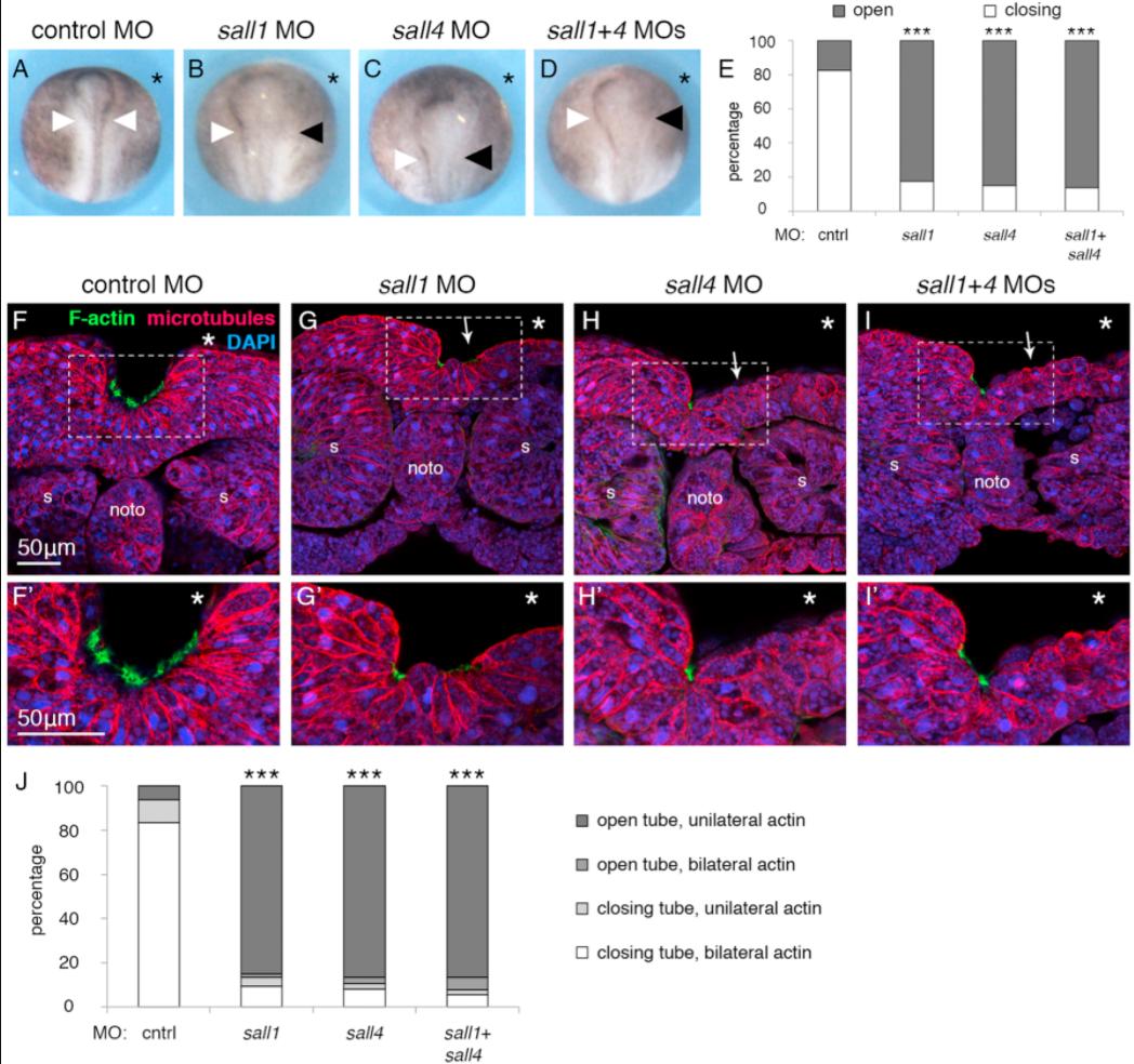 Neural tube morphogenesis is disrupted in sall morphants. (AâD) Stage 16 embryos after unilateral injection of morpholino(s); dorsal view, anterior up. Asterisks in images indicate injected side; white arrowheads indicate normal neural fold formation; black arrowheads indicate failed neural fold formation. Quantification (E) shows the percentage of embryos with closing (white bars) or open (grey bars) neural tubes. n >500 embryos per condition; *** p<0.001 by pairwise chi-squared test. (F-Iâ²) Confocal microscopy of transverse sections of morphants; dorsal is up. Sections were taken from the anterior third of embryos, where primary neurulation is most easily observed. F-actin (phalloidin, green), microtubules (anti-DM1α antibody, red), nuclei (DAPI, blue). Asterisks in images indicate injected side; white arrows indicate loss of actin accumulation. Fâ²-Iâ² show higher magnification views of boxed regions in F-I. Scale bars =50 µm. s= somite, noto = notochord. Splice-blocking sall1 and sall4 morpholinos were used here (see Supplementary Fig. 7 for results with translation-blocking morpholinos). (J) Quantification, showing percentage of embryos with closing (lighter bars) or open (darker bars) neural tubes, further classified by actin laterality (see key). Graph includes data from splice-blocking and translation-blocking morpholino experiments. n >45 embryos per experimental condition; *** p<0.001 by pairwise chi-squared test.