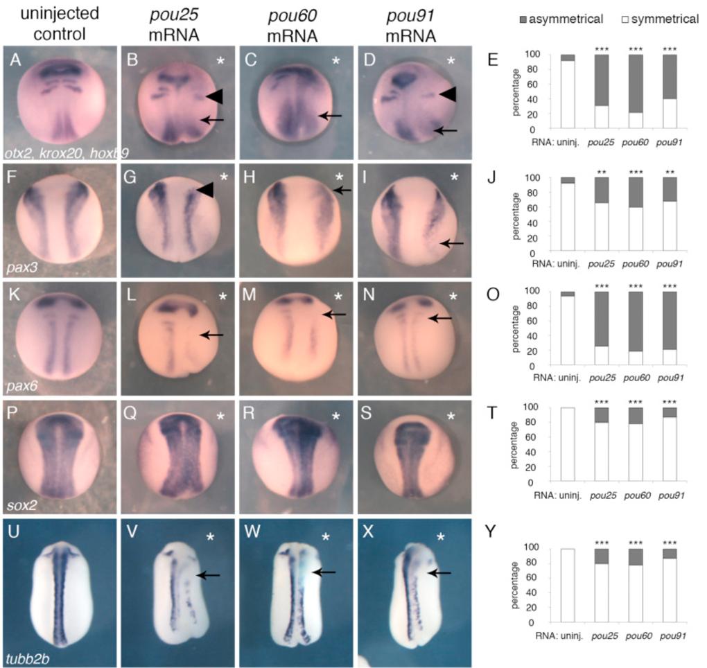 Neural patterning and differentiation are disrupted upon pou5f3 overexpression. Injection of individual pou5f3 mRNAs causes changes in neural marker gene expression, as assayed by whole-mount RNA in situ hybridization at stages 16 (A-T) and 23 (U-Y) using markers otx2, krox20, and hoxb9 in combination (A-D), pax3 (F-I), pax6 (K-N), sox2 (p-S), and tubb2b (U-X); dorsal view, anterior up. Asterisks in images indicate injected side; arrows indicate partial loss of expression; arrowheads indicate posterior shifts in expression. Quantification (E, J, O, T, and Y) shows the percentage of embryos with symmetrical (white bars) or asymmetrical (grey bars) neural gene expression. n >30 embryos per experimental condition; **, p<0.01, *** p<0.001 by pairwise chi-squared test.