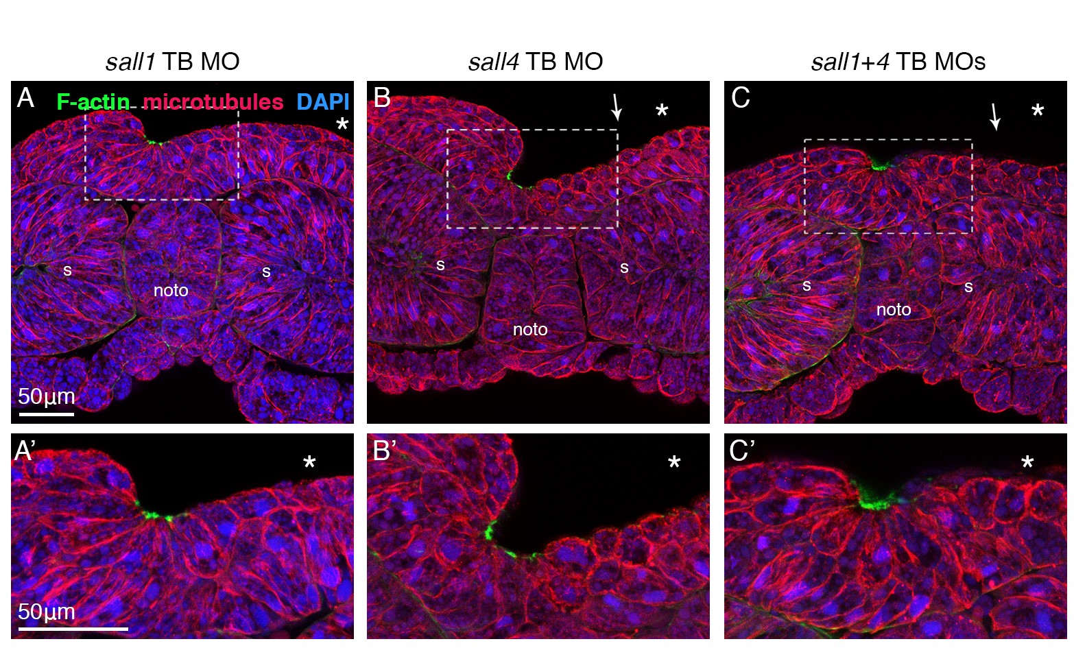 Confocal microscopy after transverse sectioning and staining of morphants; dorsal is up. Sections were taken from the anterior third of embryos, where primary neurulation is most easily observed. F-actin (phalloidin, green), microtubules (anti-DM1α antibody, red), nuclei (DAPI, blue). Asterisks in images indicate injected side; white arrows indicate loss of actin accumulation. Aâ-Câ show higher magnification views of A-C. Scale bars = 50μm. s = somite, noto = notochord. Compare to Figure 3 F-Iâ, splice-blocking morpholinos; see Figure 3 J for quantification of phenotypes in all sall morphants.