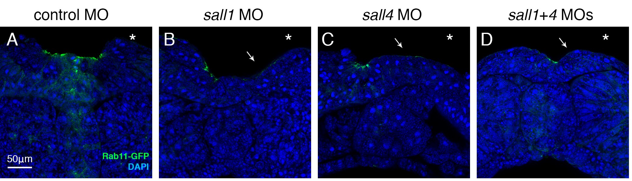 Splice-blocking sall1 and sall4 morpholinos induce loss of apical Rab11-GFP (green) expressed from bilaterally injected rab11-gfp mRNA, as assayed by confocal microscopy after transverse sectioning and DAPI (blue) staining of morphants; dorsal is up. Splice-blocking sall1 and sall4 morpholinos were injected unilaterally into the embryos shown here. Representative images are shown. Asterisks in images indicate injected side; white arrows indicate partial loss of Rab11-GFP expression. Scale bars = 50μm.