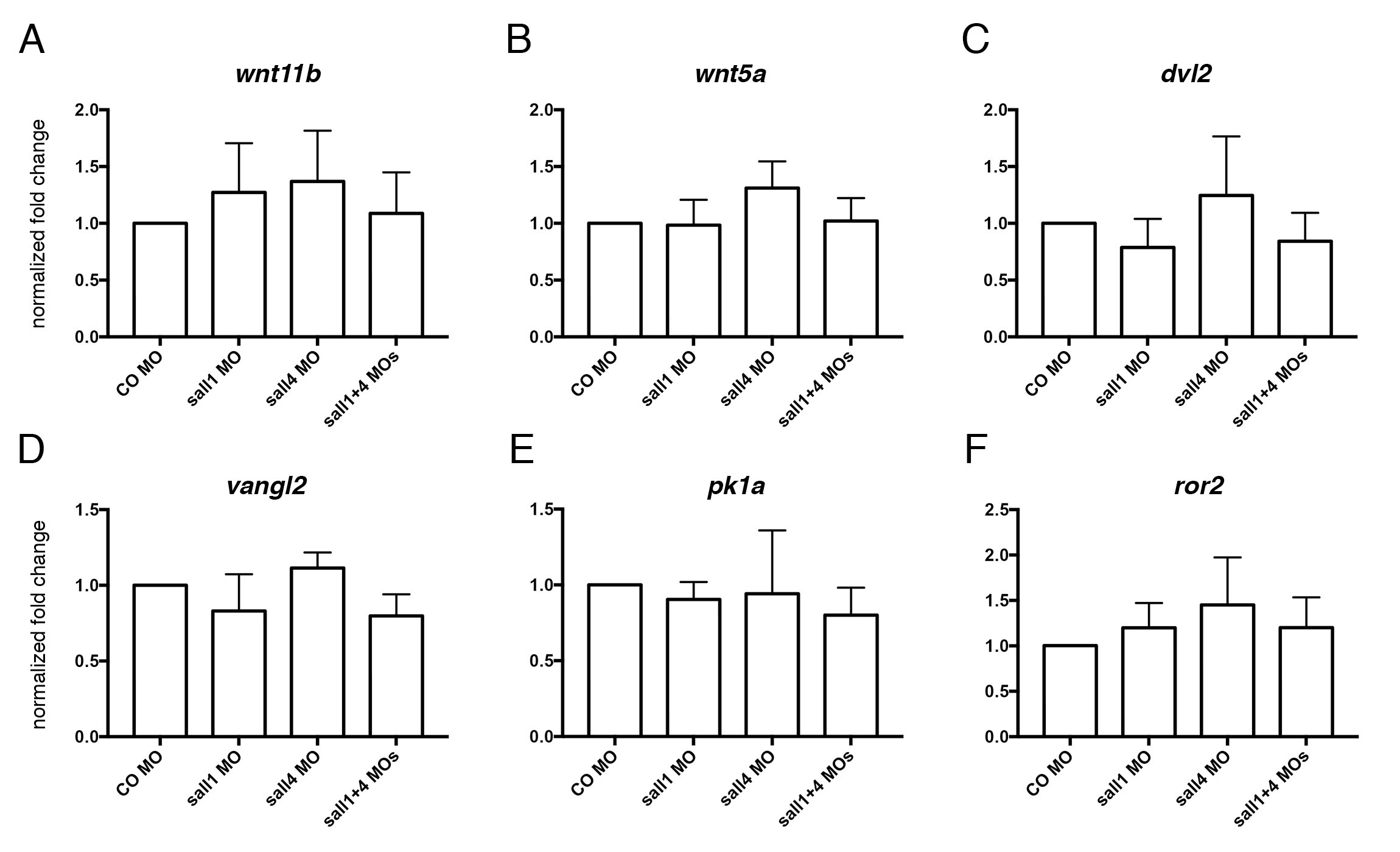 Quantitative RT-PCR on bilaterally-injected sall morphants; no changes compared to the control were significant (p < 0.05) by Tukey’s Honestly Significantly Different test on data from 4 biological replicates.
