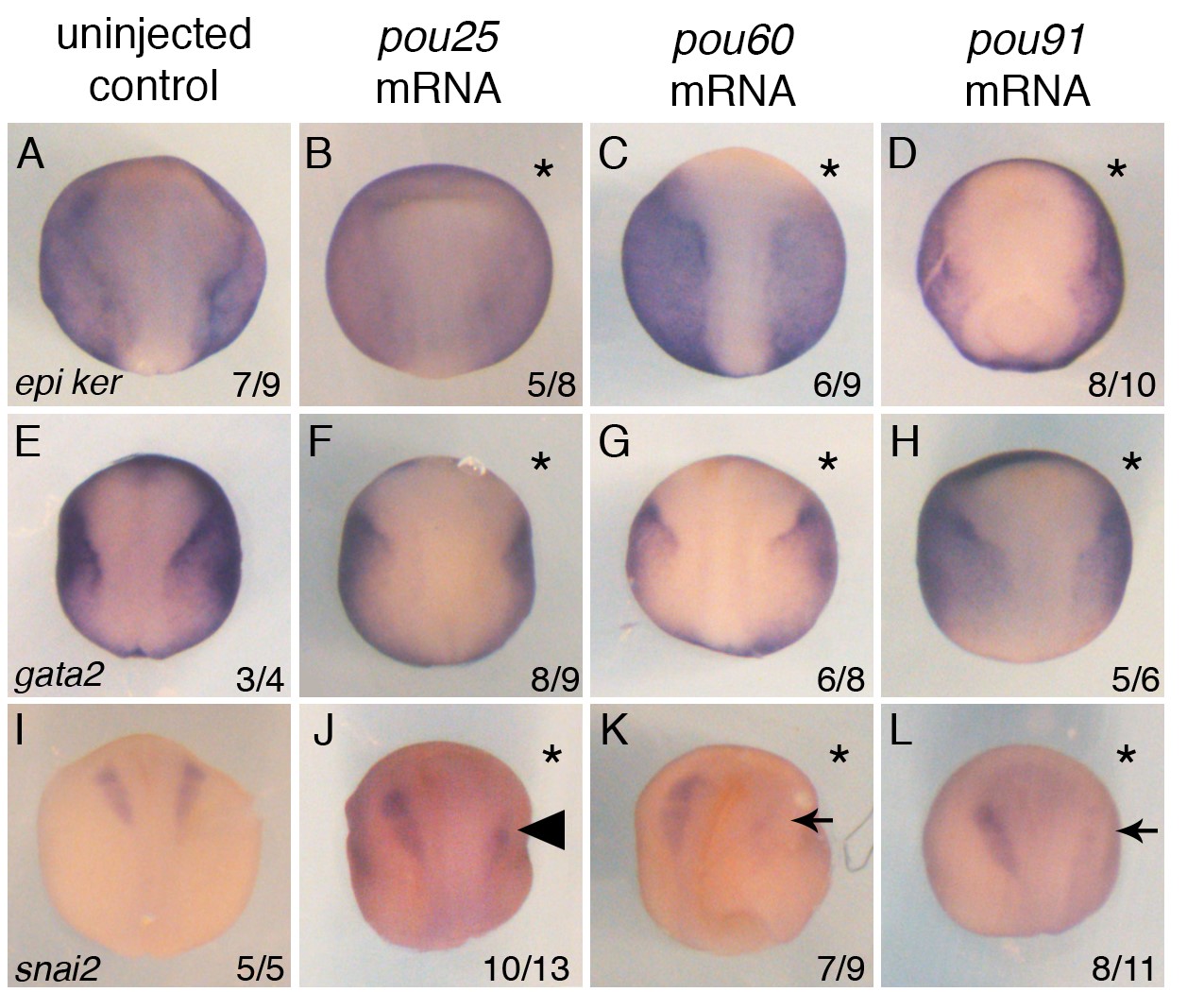 Whole-mount RNA in situ hybridization for epidermal (A-H) and neural crest (I-L) marker gene expression at stage 16; dorsal view, anterior up. Individual mRNAs for pou5f3 family members were injected unilaterally into the embryos shown here. Representative images are shown for epidermal keratin (epi ker, A-D), gata2 (E-H), and snai2 (I-L). Asterisks in images indicate injected side; arrows indicate partial loss of expression; arrowheads indicate posterior shifts in expression. Values in the lower right of each panel indicate the number of embryos with the depicted expression pattern.