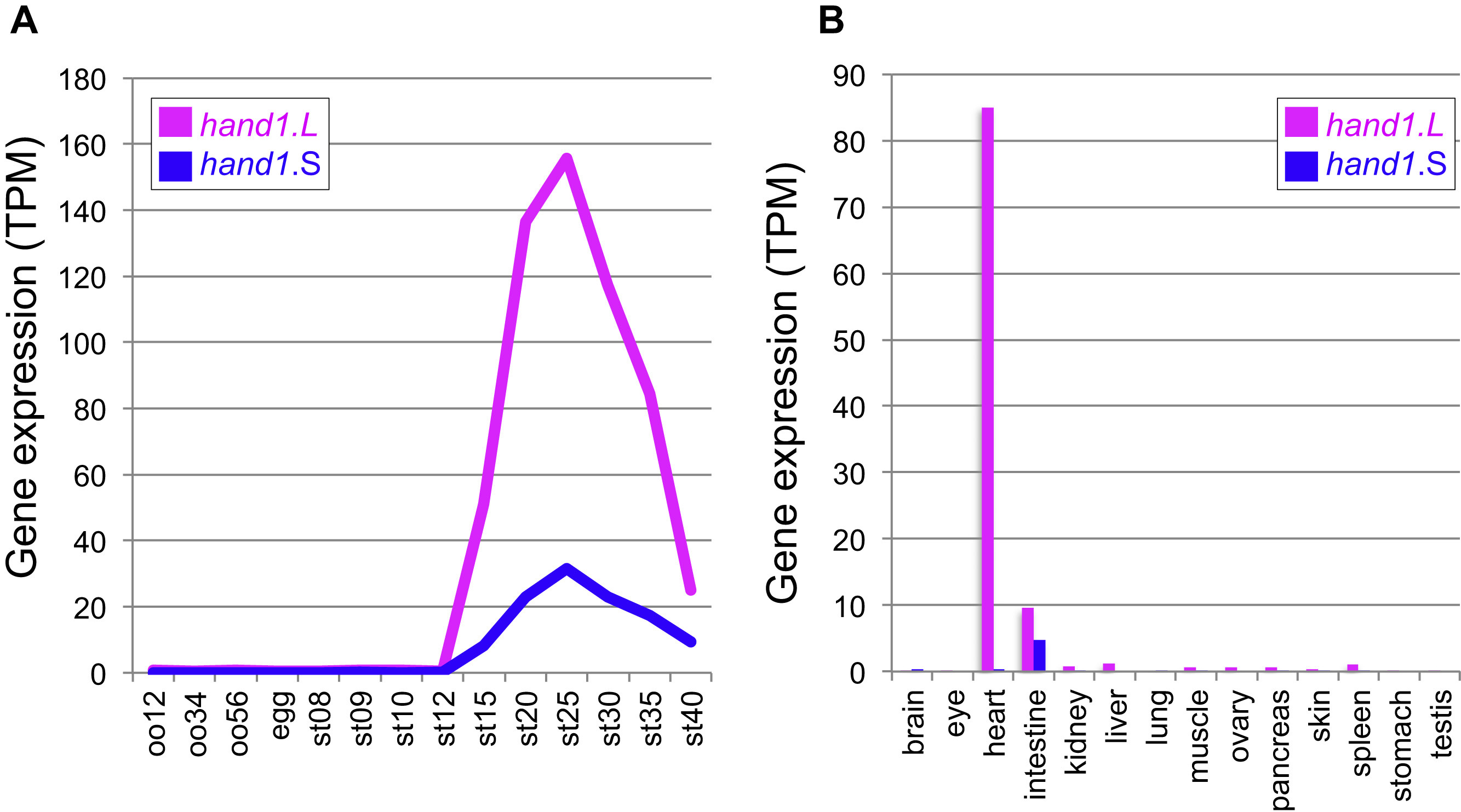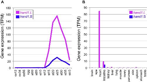 RNA-seq analysis of developing embryos and adult tissues. Expression of hand1 homeologs in developing embryos (A) and in adult tissues (B).