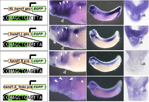 Transgenic reporter analysis of the hand1.L and hand1.S promoters. Green fluorescent protein (GFP) expression pattern driven by hand1 promoters. The reporter constructs are shown on the left, and higher magnification images and cross-section of the heart are shown in the middle. A thymidine in hand1.S putative Myod1-binding site was substituted into cytosine. E-box was indicated by the green boxes. Gray arrowhead: heart; white arrowhead: branchial arches; white arrows: pronephric duct.