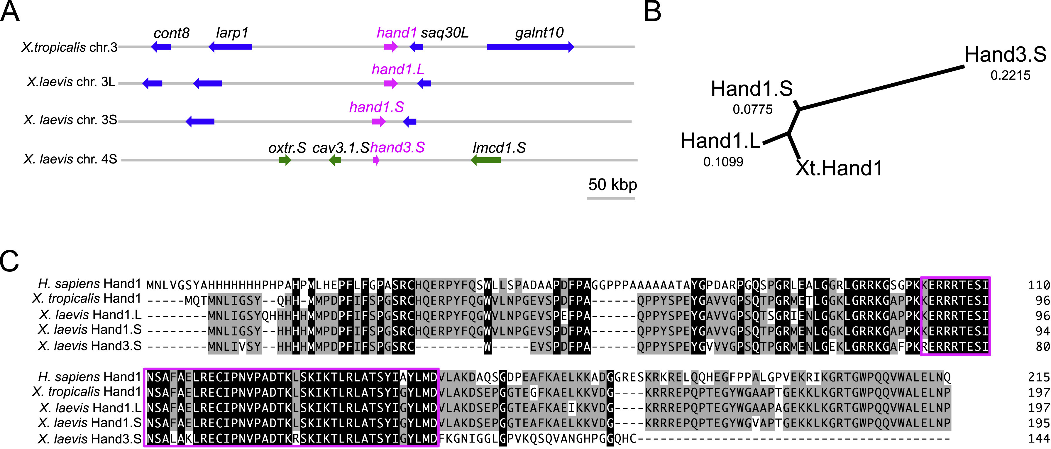 (A) Synteny conservation analysis of hand1. These genes were identified in the Xenopus laevis genome assembly X. laevis (v9.1) and X. tropicalis (v9). Arrows indicate the orientation of transcription. Only part of the chromosome around the hand loci is shown. (B) A phylogenetic tree analysis of hand1 gene products. This tree was constructed using the neighbor-joining method. Numbers indicate the ratios of non-synonymous to synonymous divergence (dN/dS) between X. tropicalis and X. laevis homeologs. (C) Amino acid alignments of the Hand1 family. The bHLH DNA-binding domains are indicated by the magenta boxes.