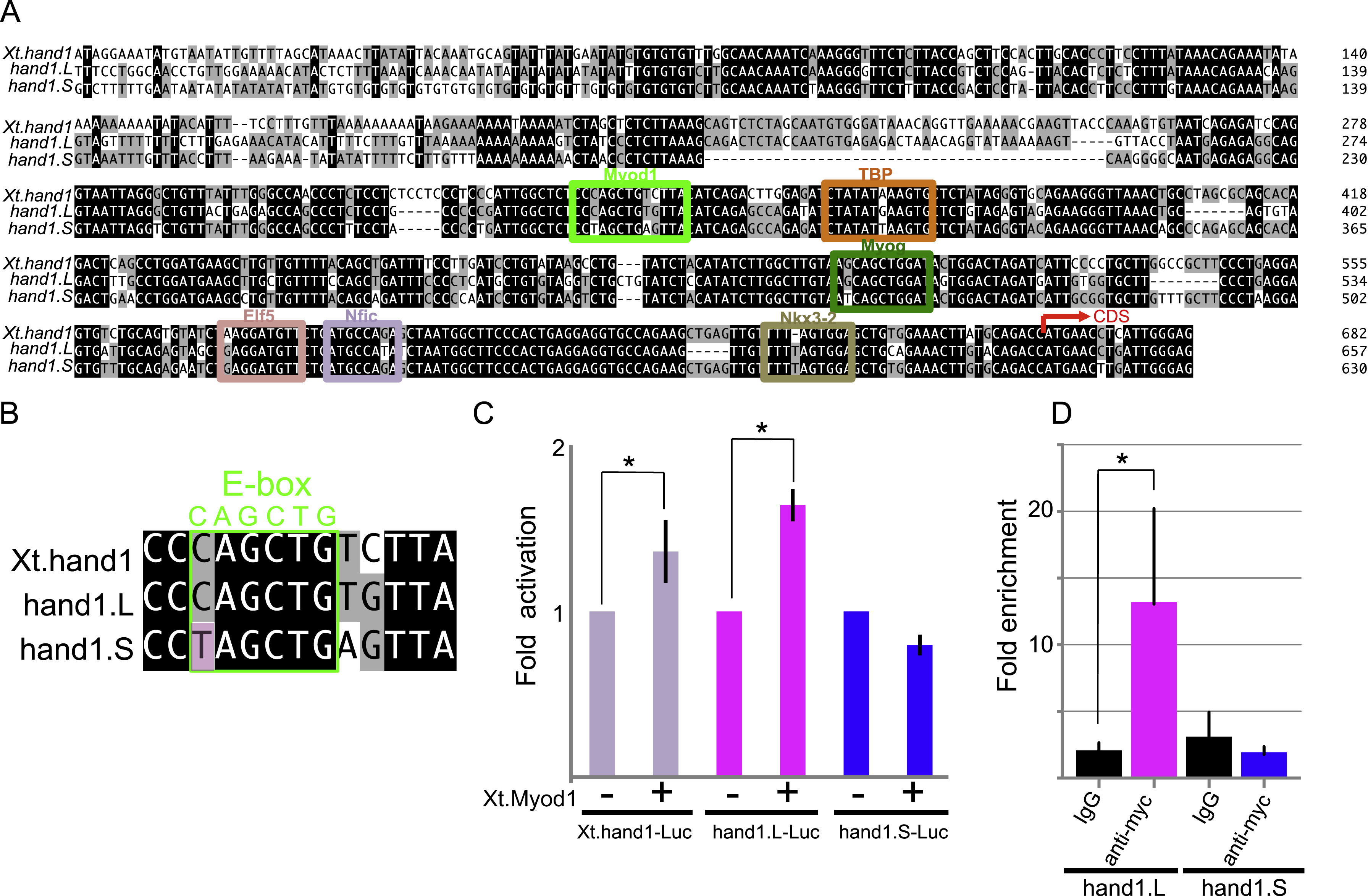 Divergence of enhancer activity between hand1.L and hand.S promoters. (A-B) Alignment of the hand1 promoter element (CNE) and potential transcription factor-binding motifs (A) and higher magnification image of potential Myod1-binding motifs. (C) Transcriptional activation of the hand1.L promoter by Myod1. Firefly luciferase activity was measured and normalized to Renilla luciferase using the dual luciferase assay kit. Luciferase data are expressed as fold activation relative to the empty expression vector. Error bars indicate ±SD, and an asterisk indicates p-value (P<0.05, n=3, two-tailed Student's T-test). (C) Myod1 protein enriched on hand1.L promoter compared with hand1.S promoter. Error bars indicate ±SD, and an asterisk indicates p-value (P<0.05, determined by one-way ANOVA with Tukey's multiple comparison test).