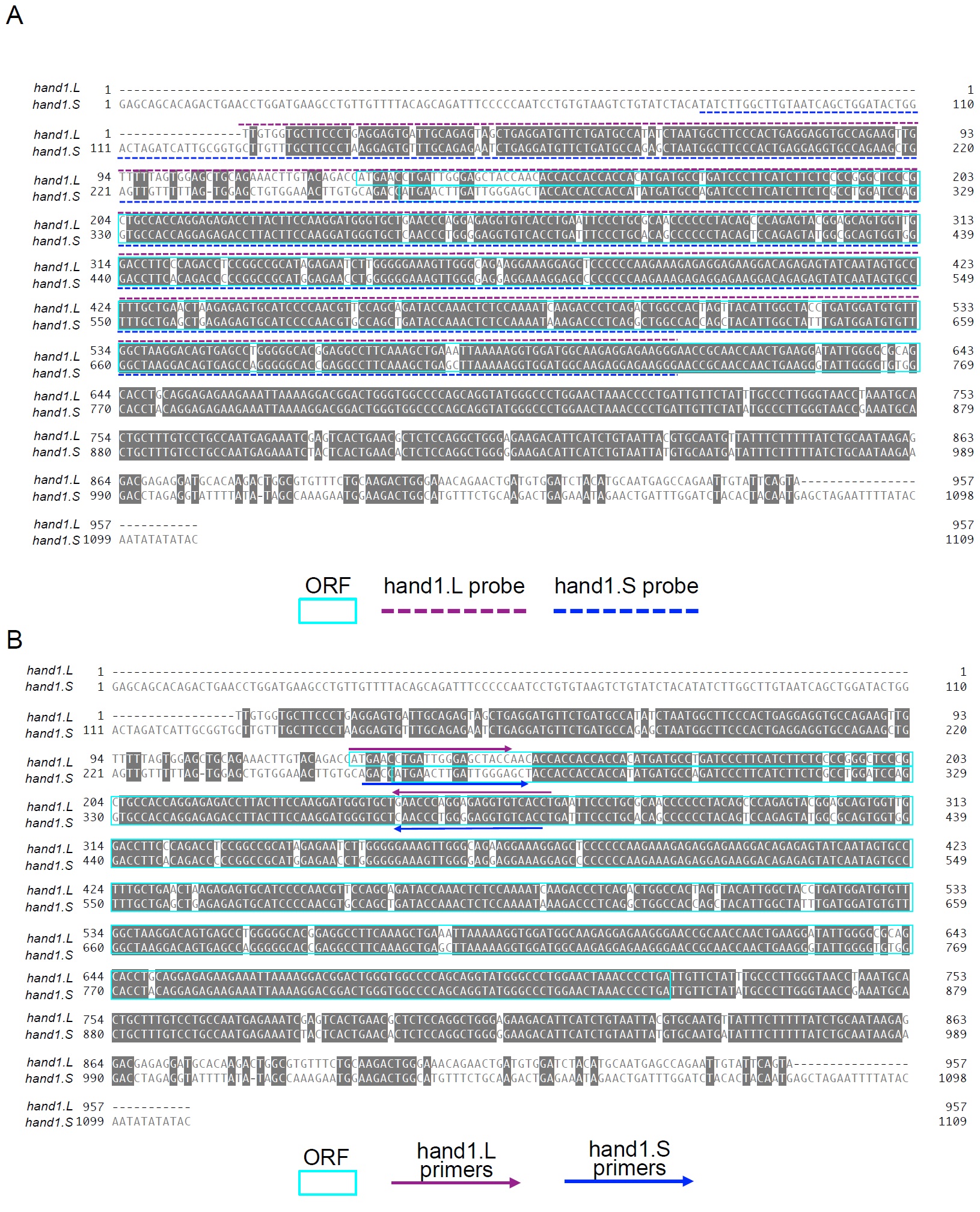 Supplementary materialSupplementary Fig 1. Target sequences of hand1 for in situ hybridization and RT-PCR. The aligned nucleotide sequences of hand1. L and hand1.S. The coding sequences are indicated by the light blue boxes, and the target sequences for L and S are indicated by the dotted purple line and dotted blue line, respectively (A). Arrows indicate the location of RT-PCR primers (B).
