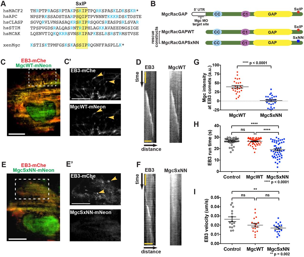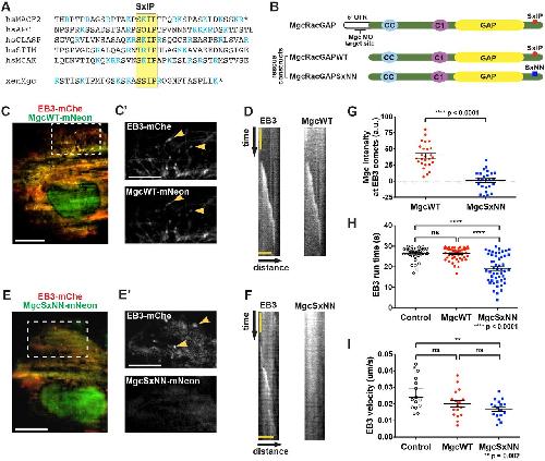 comets, 10 cells. (I) Velocity of EB3–mChe comets. Control=15 EB3 comets, 7 cells; MgcWT=17 EB3 comets, 9 cells; MgcSxNN=17 EB3 comets, 9 cells.