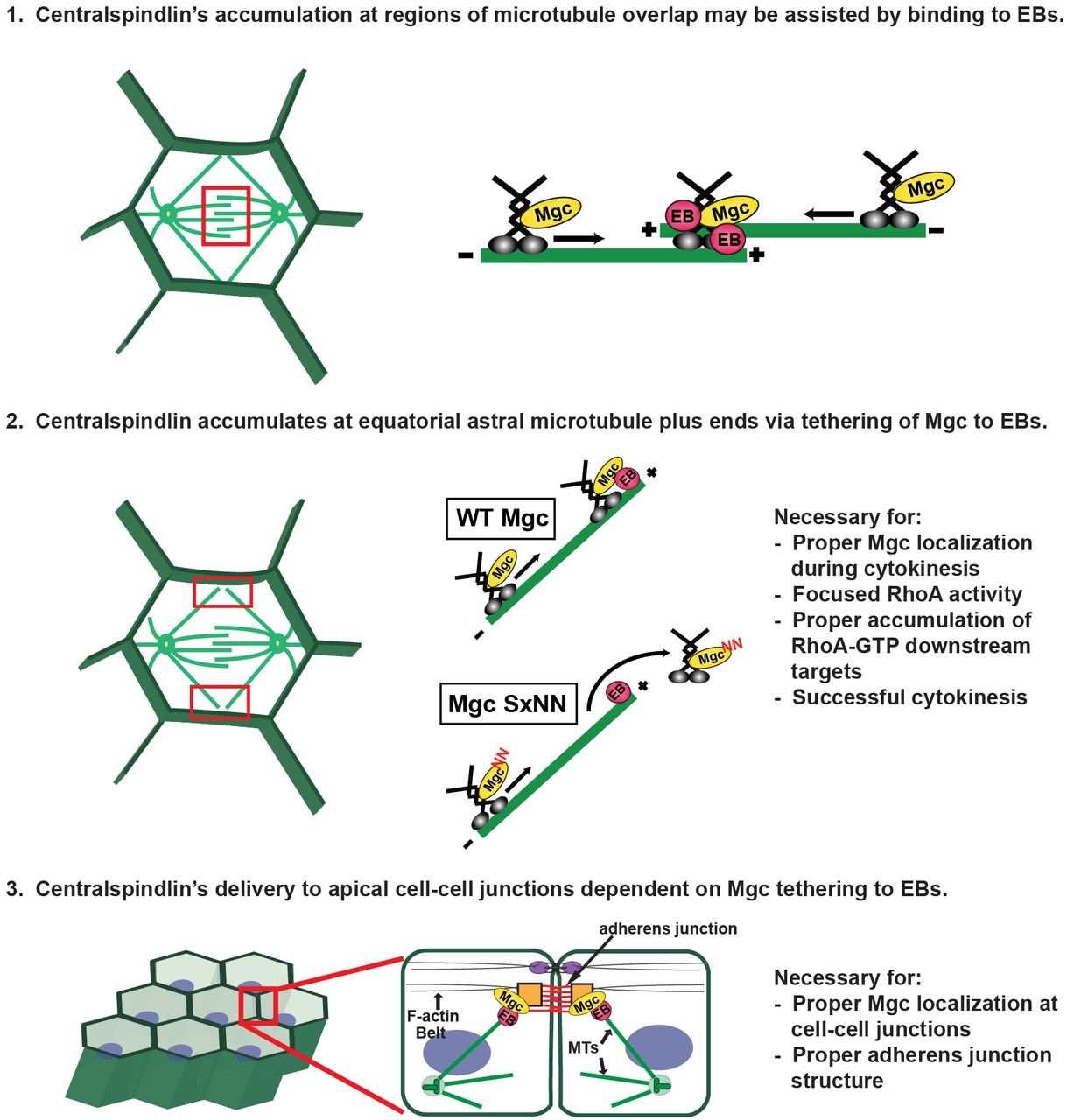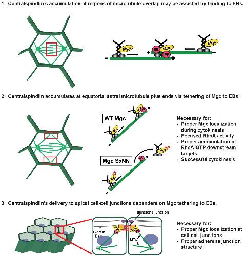 Fig. 7. Model of MgcRacGAP tethering to MT plus ends. We propose that MKLP1 transports Centralspindlin toward MT plus ends, and the Mgc SxIP motif