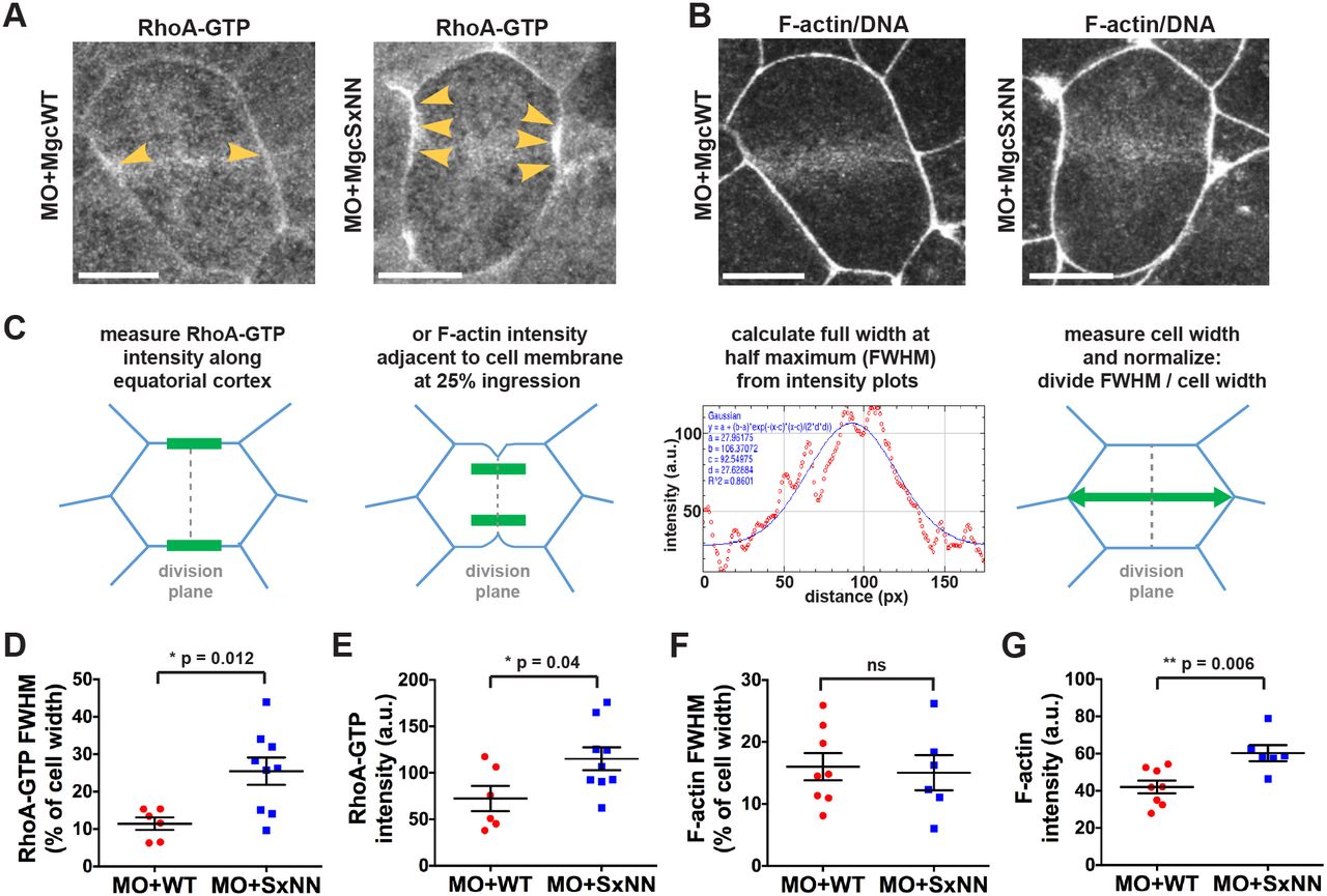 cells; MO+MgcSxNN=9 cells. (F) FWHM quantification of F-actin contractile ring breadth. MO+MgcWT=8 cells; MO+MgcSxNN=6 cells. (G) F-actin contractile ring