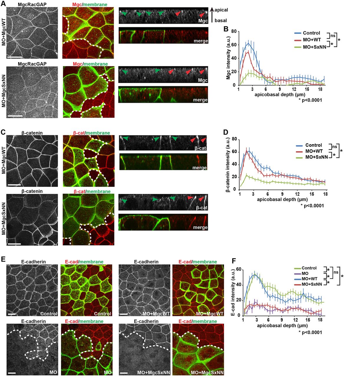 along the bicellular junctions from the apical to basal surfaces. Control, 17 cells; MO+MgcWT, 16 cells; MO+MgcSxNN, 19 cells. (E) E-cadherin (pseudo-colored