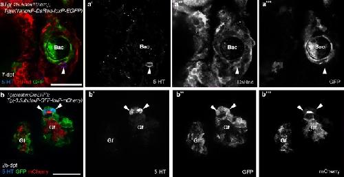 Figure 1. Zebrafish NECs are not neural crest-derived: genetic lineage-tracing data.(a) Schematic of a 7–8 dpf zebrafish; dotted line indicates section plane in b-f’. (b) Hematoxylin and eosin staining at 7-dpf reveals gill filaments branching from branchial arch cartilages, and the orobranchial cavity. Dashed box indicates approximate region in c,g. (c–d’) In 7-dpf Tg(-28.5sox10:cre);Tg(ef1a:loxP-DsRed-loxP-EGFP) zebrafish, GFP labels neural crest-derived branchial arch cartilage and mesenchyme, but not NECs in the gill filaments (identified by immunoreactivity for serotonin, 5-HT; arrowheads). (e–f’) Horizontal section through the gills of a 20-dpf Tg(-4.9sox10:creERT2);Tg(βactin:loxP-SuperStop-loxP-DsRed) zebrafish. DsRed (brown precipitate) labels neural crest-derived gill pillar cells, but not NECs (arrowheads; inverted fluorescent image overlaid on bright-field image). (g–h’) In 8-dpf Tg(crestin:creERT2);Tg(-3.5ubi:loxP-GFP-loxP-mCherry) zebrafish, mCherry labels gill pillar cells but not NECs (arrowheads). 5-HT, serotonin; Bac, branchial arch cartilage; Gf, gill filament; La, lamellae; Nt, neural tube; Obc, orobranchial cavity. Scale-bars: 50 μm in b,c,e,g; 25 μm in d,f,h.DOI: http://dx.doi.org/10.7554/eLife.21231.003Figure 1—figure supplement 1. The promoters driving the Cre-switchable reporter cassettes are active in NECs.In 7-dpf Tg(-28.5sox10:cre);Tg(ef1a:loxP-DsRed-loxP-EGFP) (a–a’’’) and 25-dpf Tg(crestin:creERT2);Tg(-3.5ubi:loxP-GFP-loxP-mCherry) (b–b’’’) zebrafish, NECs in the gill filaments (identified by immunoreactivity for serotonin, 5-HT; arrowheads) express the un-switched reporter gene. 5-HT, serotonin; Bac, branchial arch cartilage; Gf, gill filament. Scale-bar: 25 μm.DOI: http://dx.doi.org/10.7554/eLife.21231.004 |