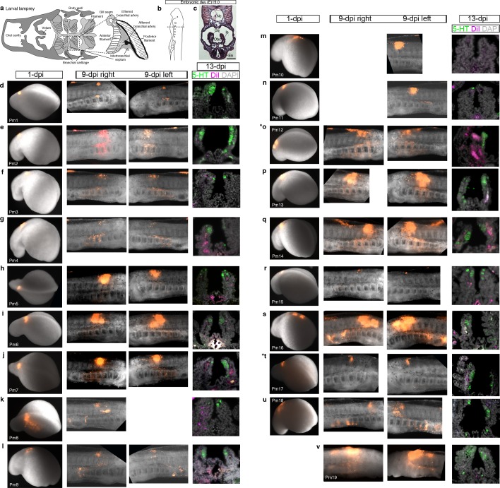 Figure 4. Putative lamprey NECs are not neural crest-derived.(a) Schematic larval lamprey section (modified from Barreiro-Iglesias et al., 2009) showing gill pairs in the orobranchial cavity, supported by an interbranchial septum, and a single gill at higher power. (b) Schematic Piavis-stage 17 (E19) lamprey (modified from Tahara,1988). Dotted line shows section plane in c,d,i,j,n. (c) Hematoxylin and eosin staining at E19 shows internal gills as âstalksâ within the orobranchial cavity. (d) Putative NECs (serotonergic cells associated with HNK1 epitope-immunoreactive neurites) are first visible at E18.5 in the medial gill epithelium. (e) Schematic (modified from Tahara,1988) showing neural crest labelling by DiI injection at E5 (Piavis stages 11â12). (fân) Two different embryos (fâj, kân), showing DiI-labeled neural crest cells migrating ventrally (arrowheads, g,l) into the branchial arches, contributing to branchial arch basket and gill supporting cells (arrowheads, j,n), but not serotonergic cells (putative NECs) in the orobranchial epithelium (i,j) or gills (n). 5-HT, serotonin; Ba, branchial arch; Bab, branchial arch basket; En, endostyle; Gs, gill seam; Is, interbranchial septum; Nc, notochord; Nt, neural tube; Obc, orobranchial cavity. Scale-bar: 50 μm.DOI: http://dx.doi.org/10.7554/eLife.21231.010Figure 4âfigure supplement 1. Confirmation of successful targeting of pharyngeal arch-destined neural crest cells in all lamprey embryos analyzed for neural crest contribution to putative NECs.For orientation, the first three panels are repeated from Figure 4. (a) Schematic larval lamprey section (modified from Barreiro-Iglesias et al., 2009) showing gill pairs in the orobranchial cavity, supported byan interbranchial septum. (b) Schematic Piavis-stage 17 (E19) lamprey (modified from Tahara,1988). Dotted line: section plane. (c) Hematoxylin and eosin staining shows internal gills as âstalksâ within the orobranchial cavity. (dâv) Each row shows one of the 19 lamprey embryos with DiI-labeled neural crest derivatives near serotonergic putative NECs at the final analysis. The first panel shows the site of DiI injection at one day post-injection (dpi) (missing for embryo Pm19); the second and third panels show DiI-labeled neural crest cells in the branchial arches in right and/or left-side views at 9-dpi; the fourth panel shows a view of the internal gills in section at 13-dpi (for section plane, see dotted line in panel a), showing DiI contribution to gill support cells, but not to the putative NECs (serotonergic cells) in the gill epithelium. Asterisks indicate the embryos from which data are shown in Figure 4 (Pm12 and Pm17). 5-HT, serotonin; En, endostyle; Gs, gill seam; Is, interbranchial septum; Nc, notochord; Obc, orobranchial cavity.DOI: http://dx.doi.org/10.7554/eLife.21231.011 |
