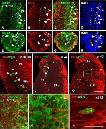 FIGURE 7. Analysis of progenitor cells at embryonic stages (Sox2, DCX, PH3). Micrographs of transverse sections through the pallium of Xenopus laevis at embryonic stages 37/38 (AâD,I,L) and 42 (EâH,J,K,M,N) showing the codistribution of the progenitor marker Sox2 (A,E) and the neuroblast marker DCX (B,F) in combination to DAPI (D,H), and the combination of DCX with the mitotic marker PH3 (IâK). In each panel the developmental stage and the color code for the used markers are indicated. All micrographs are confocal images, and the higher magnifications (L,M,N) correspond to the framed areas, as indicated (white boxes in C,G,K). At the ventricular zone there were observed double labeled cells for Sox2 and DCX (see arrowheads in AâC, EâG), and those cells were mitotic cells (see white circles and filled arrowheads in D,H). Additional double labeled cells were observed away from the ventricle (see empty arrowheads in EâH). The combination of DCX and PH3 showed double DCX/PH3 labeled cells in the ventricle and away from it (see arrowheads in I,J). Scale bars = 25 μm (AâH,L,M), 50 μm (IâK). See list for abbreviations. |