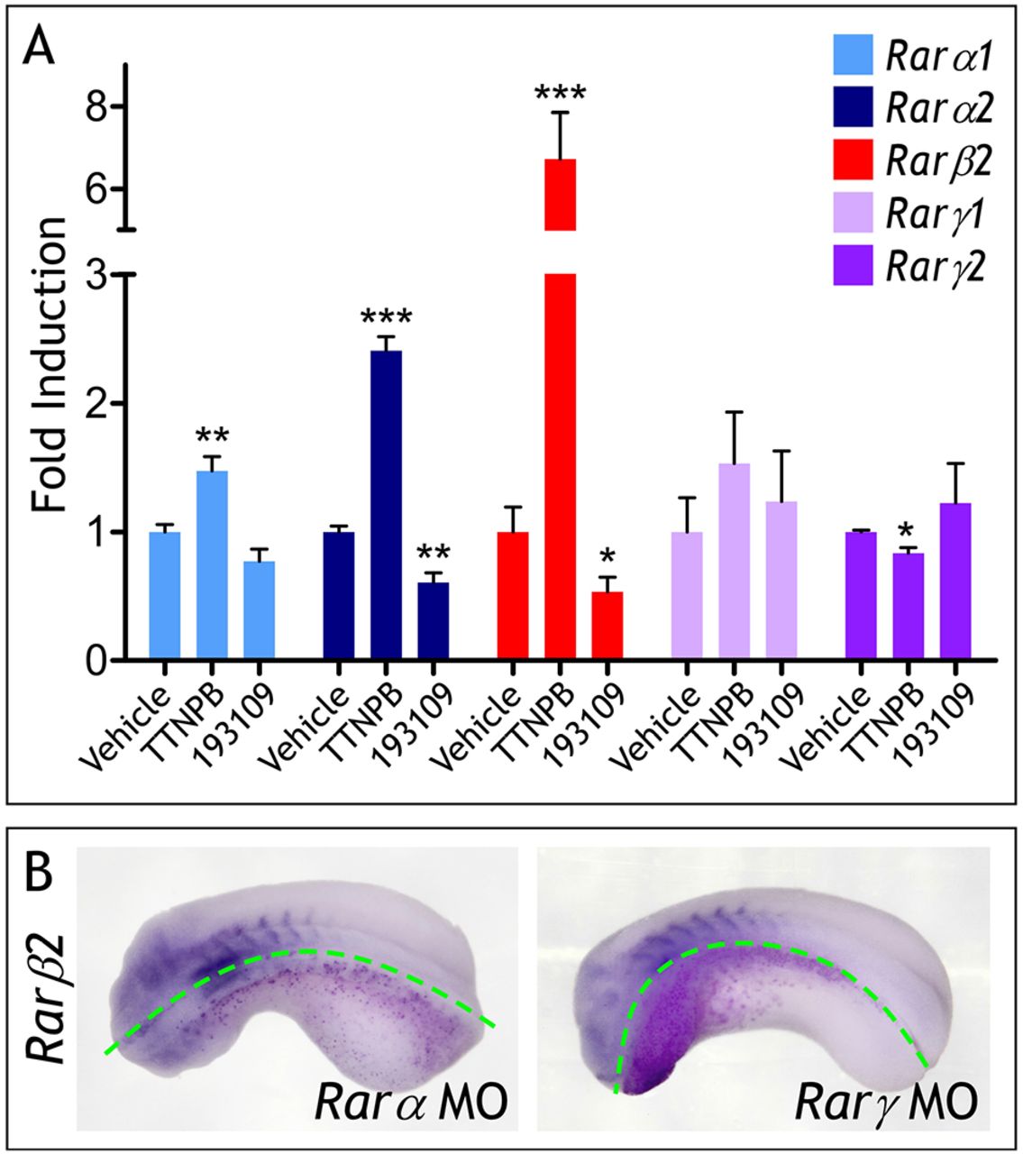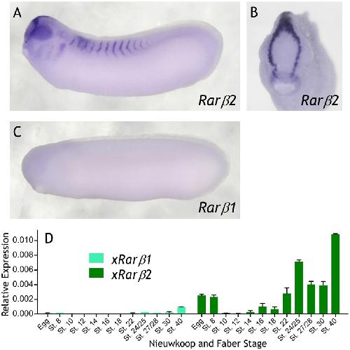 (A-C) Whole-mount in situ hybridization of Rarβ1 and Rarβ2