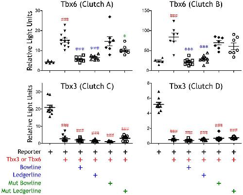 ***Pâ¤0.001 and *Pâ¤0.05 relative to reporter+Tbx6 mRNA.