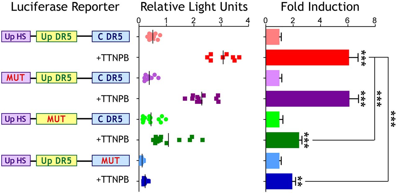 reporter activity and TTNPB responsiveness is reduced by mutating the upstream half-site; however, fold induction is equivalent to wild type. Error bars indicate