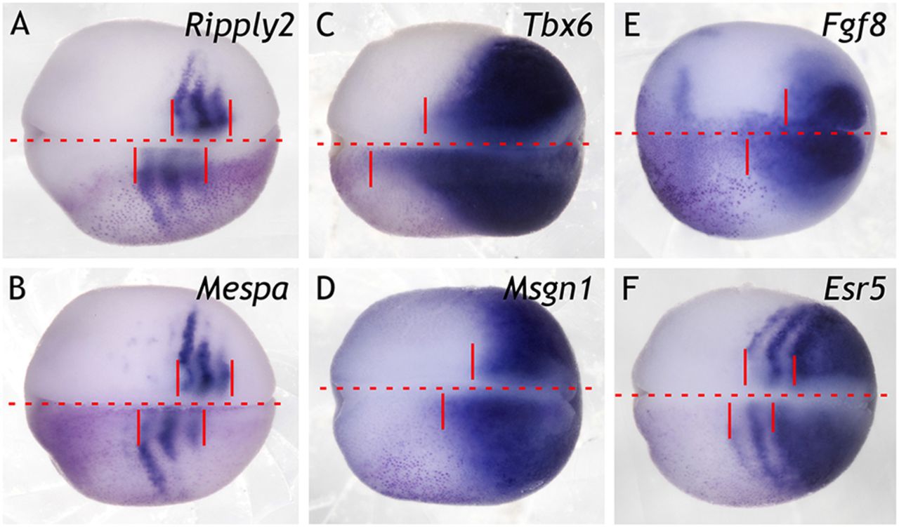 Fgf8, 9/13; Esr5, 19/20). Broken red line indicates the midline.