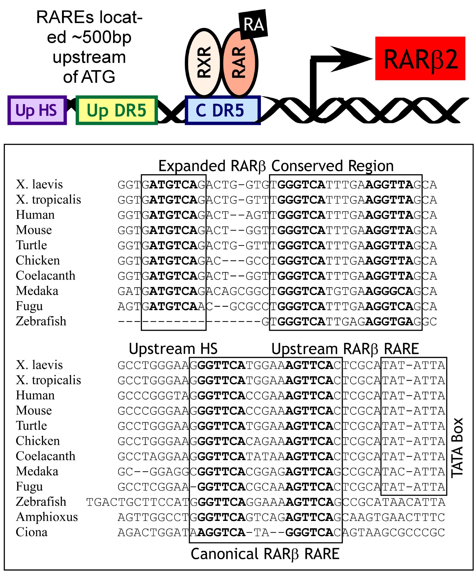 Fig. 3. Xenopus laevis RARβ2 promoter elements are required for RA responsiveness. Luciferase reporters were selectively mutated for the canonical (C)