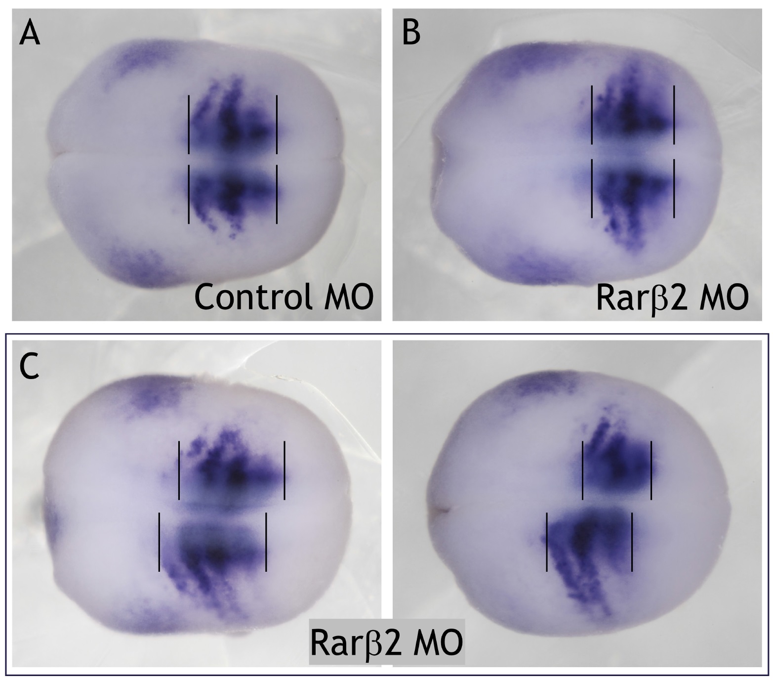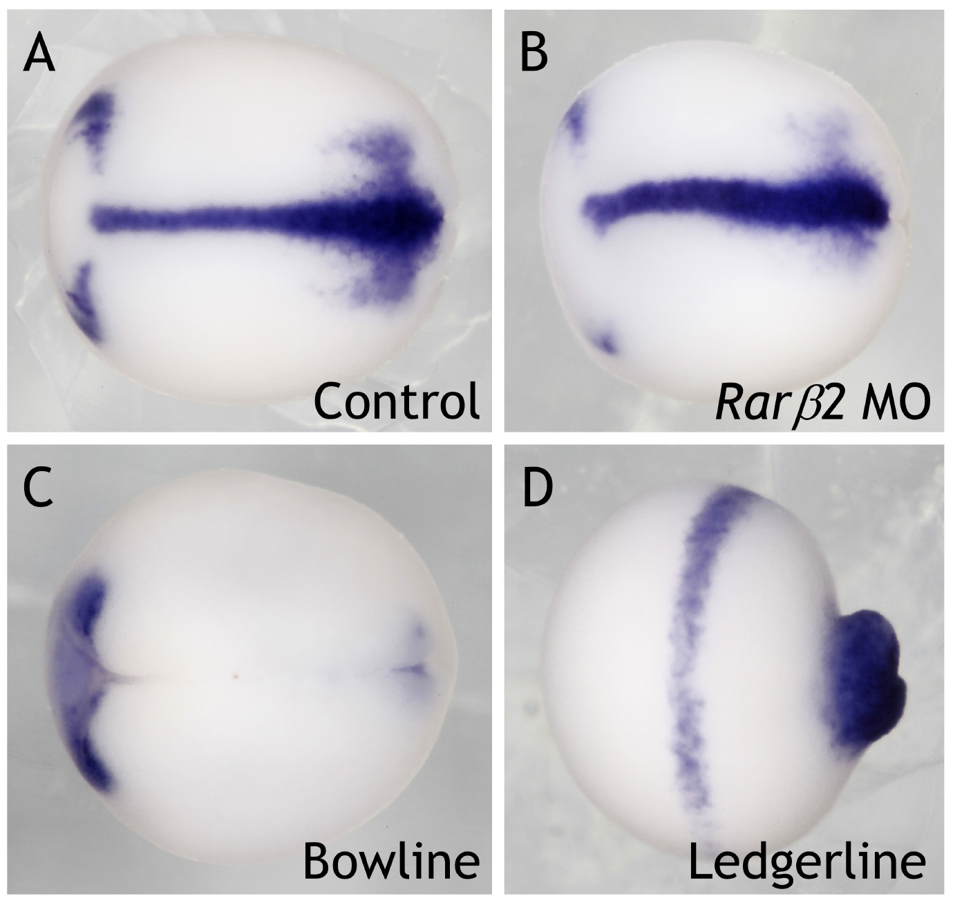 Neurula stage embryos shown in dorsal view with anterior on the left. Rarβ2