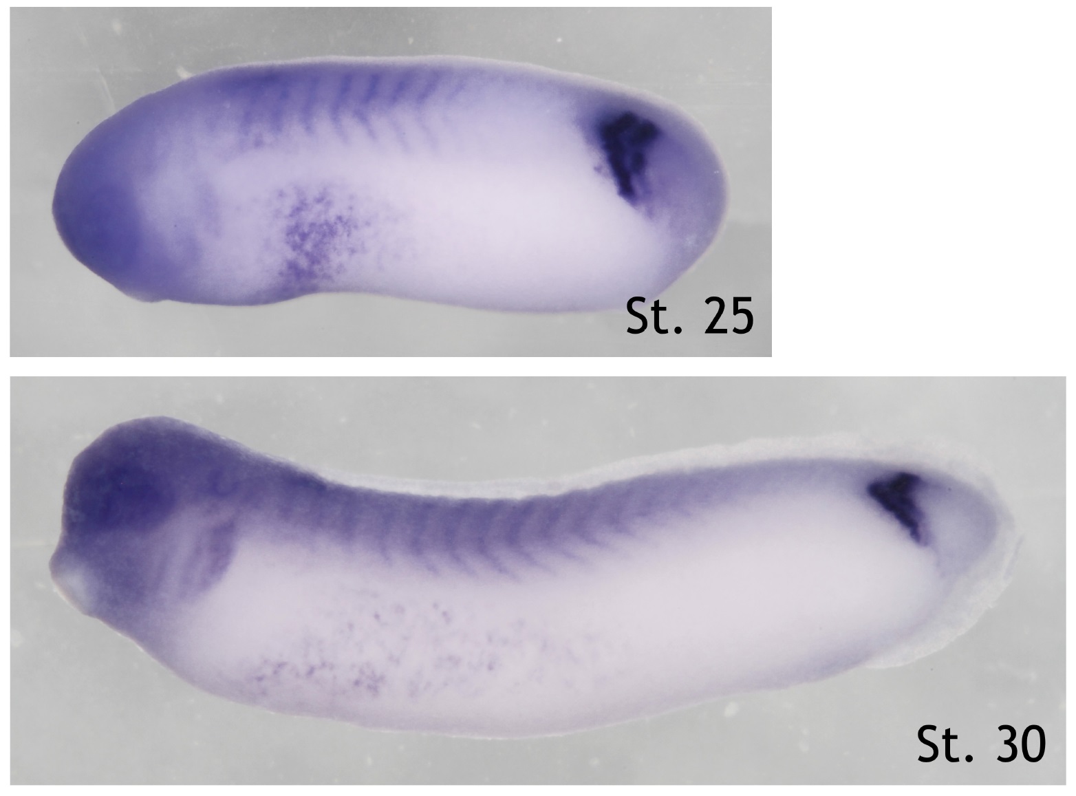 rarb (retinoic acid receptor beta) gene expression in Xenopus laevis embryo, assayed via in situ hybridization, NF stage 28, lateral view, anterior left, dorsal up.