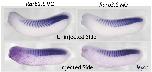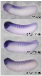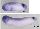 mybpc1 (myosin binding protein C1) gene expression in Xenopus laevis embryo, assayed via in situ hybridization, NF stage 28, lateral view, anterior left, dorsal up and coronal cross-section