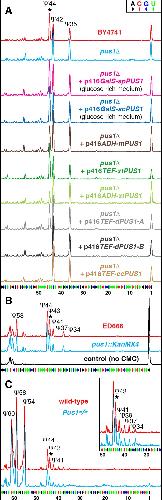 Pus1p enzymatic activity on U2 snRNA in different species. (A) S. cerevisiae U2 snRNA is normally pseudouridylated at positions 35, 42, and 44 (wild-type BY4741 strain, red trace). In a Pus1p-deficient S. cerevisiae strain, the pseudouridine at position 44 is missing (pus1Δ, blue trace). Pus1p from fission yeast S. pombe (spPus1p, magenta trace) when expressed in S. cerevisiae pus1Δ strain modifies yeast U2 snRNA as efficiently as S. cerevisiae Pus1p (scPus1p, dark blue trace). Mouse, Xenopus, and Drosophila Pus1p enzymes can rescue pseudouridylation at position 44 in yeast S. cerevisiae pus1Δ strain, yet a much higher level of expression is required (mPus1p, dark brown trace; xtPus1p, green traces; dPus1p-A/CG4159-PA, gray trace). Compare the efficiency of pseudouridylation when Xenopus Pus1p is expressed from plasmids with different promoter activities: ADH promoter (light green trace) and TEF promoter (dark green trace). Pus1p from C. elegans and the longer isoform of Drosophila Pus1p could not modify yeast U2 snRNA even when overexpressed (cePus1p, light brown trace; dPus1p-B/CG4159-PB, black trace). (B) U2 snRNA pseudouridylation mapping in S. pombe wild-type (ED666, red trace) and pus1Δ (pus1::KanMX4, blue trace) strains. U2 snRNA from the pus1Δ strain is modified at all the normal positions, including position 43. (C) U2 snRNA pseudouridylation mapping in wild-type (red trace) and Pus1 knockout (Pus1−/−, blue trace) mice. Inset in C zooms in on the branch point recognition region; note no differences between wild-type and mutant strains in their U2 snRNA modification patterns. Stars indicate peaks corresponding to pseudouridine at position 44 in S. cerevisiae U2 snRNA or equivalent position 43 in S. pombe and mouse U2 snRNA.